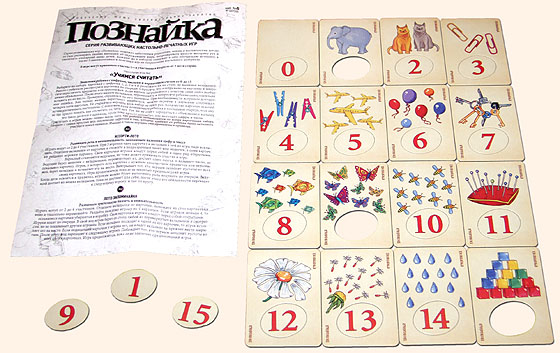 Эта развивающая настольная игра познакомит малышей в возрасте от 3 до 6 лет с цифрами и порядковым счетом от 0 до 15. За несколько обучающих занятий дети научатся пересчитывать изображенные на картинках предметы и запомнят названия цифр и чисел. В методических указаниях объяснено, как проводить уроки для малышей и как правильно распределить информационную нагрузку.